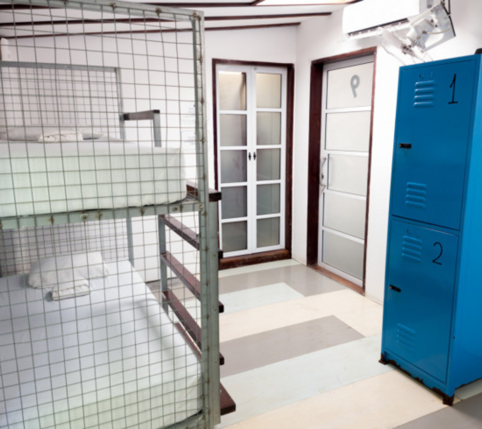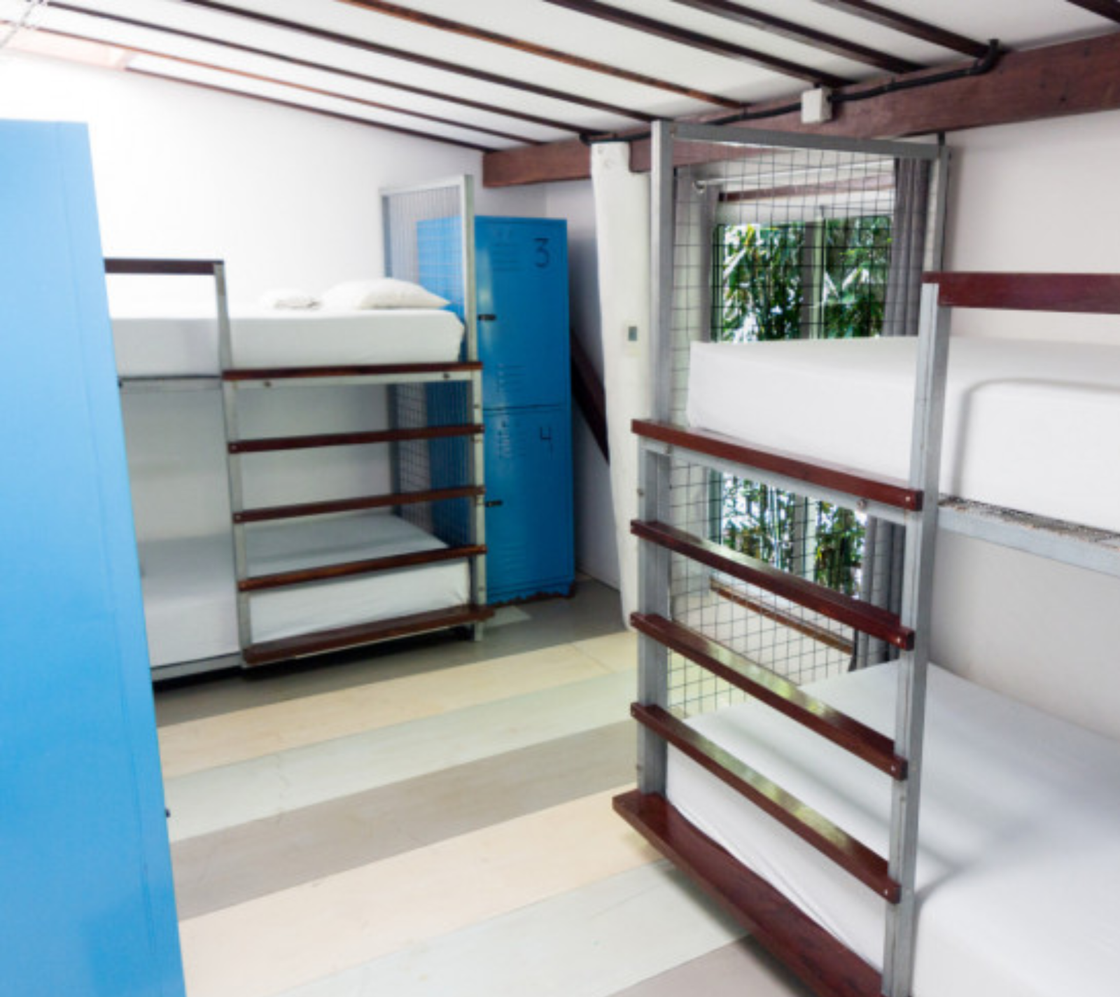 This mixed dorm has a private bathroom, ceiling fan, A/C and bunk beds with thick mattresses.